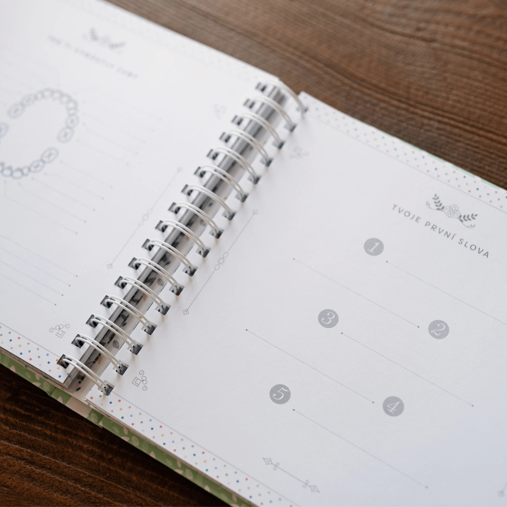 4. Nespokojte se s deníčkem miminka s měkkou vazbou, který se rozpadne kvůli nalepeným fotkám! Pořiďte si deníček Mimiadventure. Díky dvojité spirálové vazbě dokonale uchová vaše nejcennější vzpomínky.